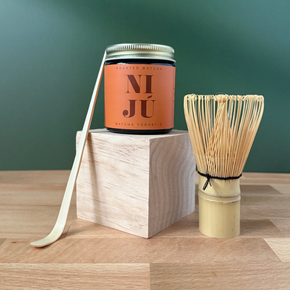 The basics that you need to get started making delicious hojicha, this set contains the traditional matcha making duo. A bamboo whisk and bamboo scoop are accompanied by a jar of Niju Roasted Matcha Hojicha, perfect for gift giving or if you are trying hojicha for the first time!